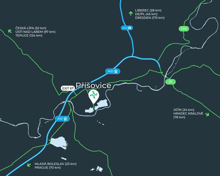 This strategic location is at the heart of a busy transport crossroad linking regional cities Mladá Boleslav, Liberec and Jičín, and providing direct access to highway D10.