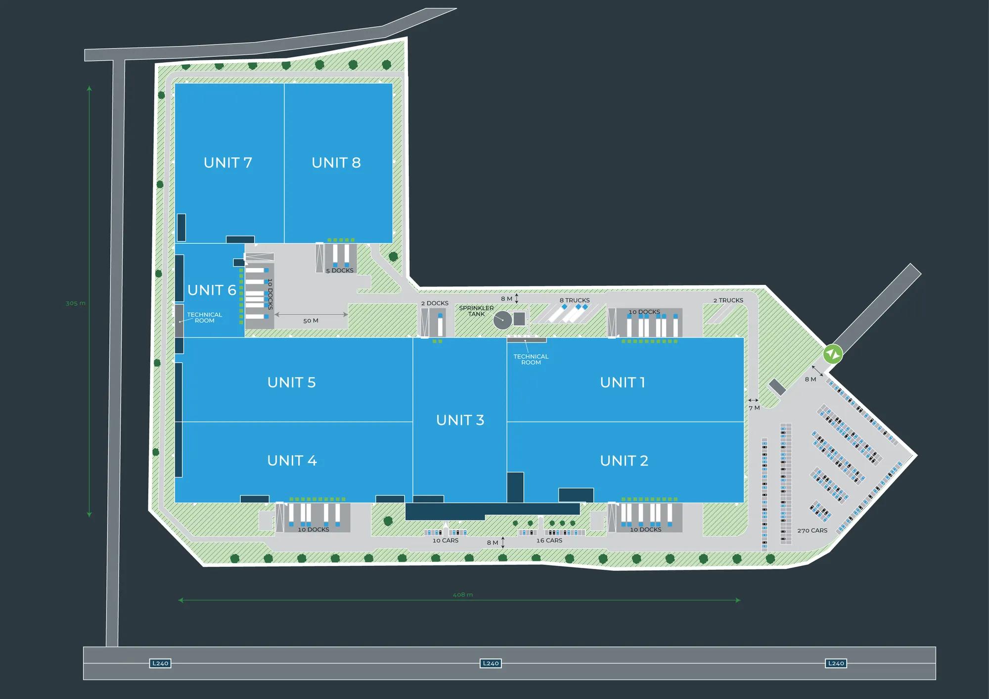Warehouse: 20408.00 sqm | Warehouse: 219669.88 sqf | Office: 717.00 sqm | Office: 7717.72 sqf | Total space: 21125.00 sqm Total space: 227387.61 sqf