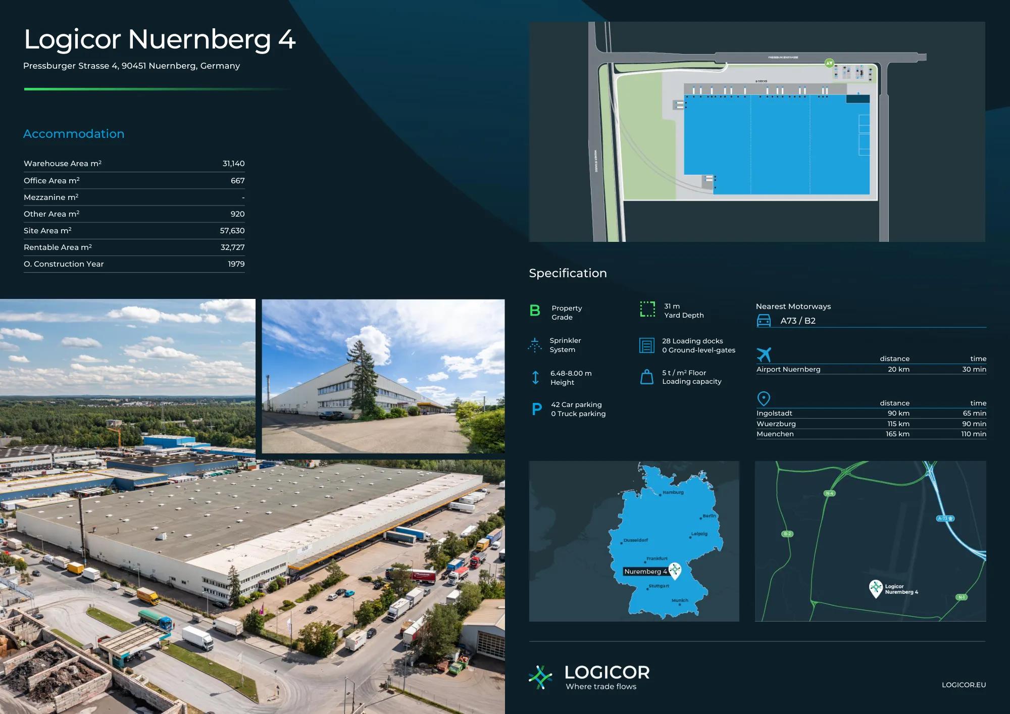 The asset is located in the port area to the south of Nuremberg. Within the district Maiach, the site is sourrounded by woods to the south, industrial area to the north and the Rhine-Main-Danube Canal to the east. The area has been developed during the construction of the Rhine-Main-Danube Canal in the 70s. The surrounding neighbourhood is also characterized by warehouses, distribution centres, production buildings and a container terminal. The area is very good connected to several motorways and federal highways (A73, A6, A9, B2, B14).