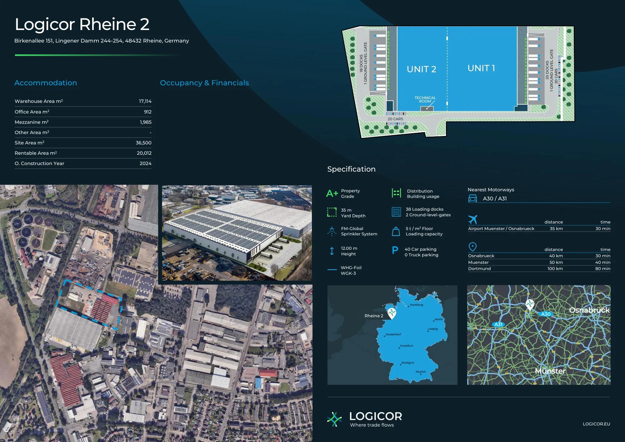 The asset is located in the north of the city of Rheine within the north-east of North Rhine-Westphalia. The site is positioned in an industrial zone mainly developed for logistics and storage purposes. Close proximity to the motorway A30 provides good access to the national and European motorways E30 and E37. A railway line is located in the immediate vicinity.