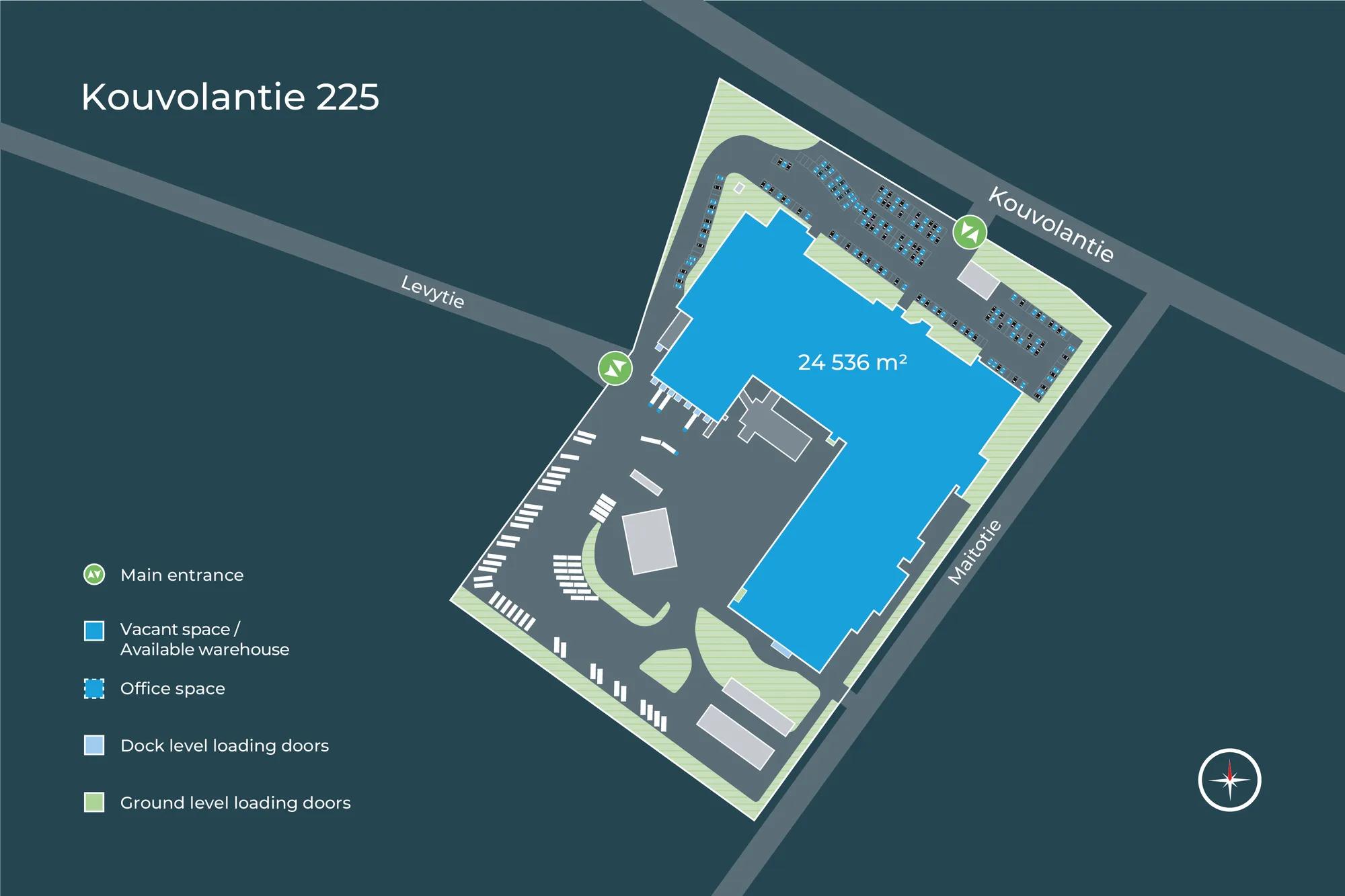 Flexible production and warehouse space with a ceiling height of 4–9 metres. The premises feature 9 loading docks, a loading platform with a large overhead door and 5 large ground-level overhead doors. There is also office space, staff break areas and other functional facilities to meet your business needs. The space can be divided into smaller units if needed.