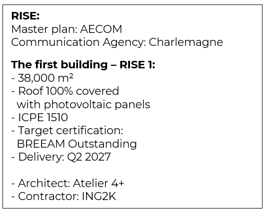 Launched as a replacement for a now vacant unit, the first RISE building will cover 38,195 m² with two divisible units of 10,700 m² on the ground floor. The first floor will be accessible via two ramps with a limited slope (≤ 8%), and will contain a 14,132 m² courier service, divisible into four lots, along with more than 2,500 m² of support offices.