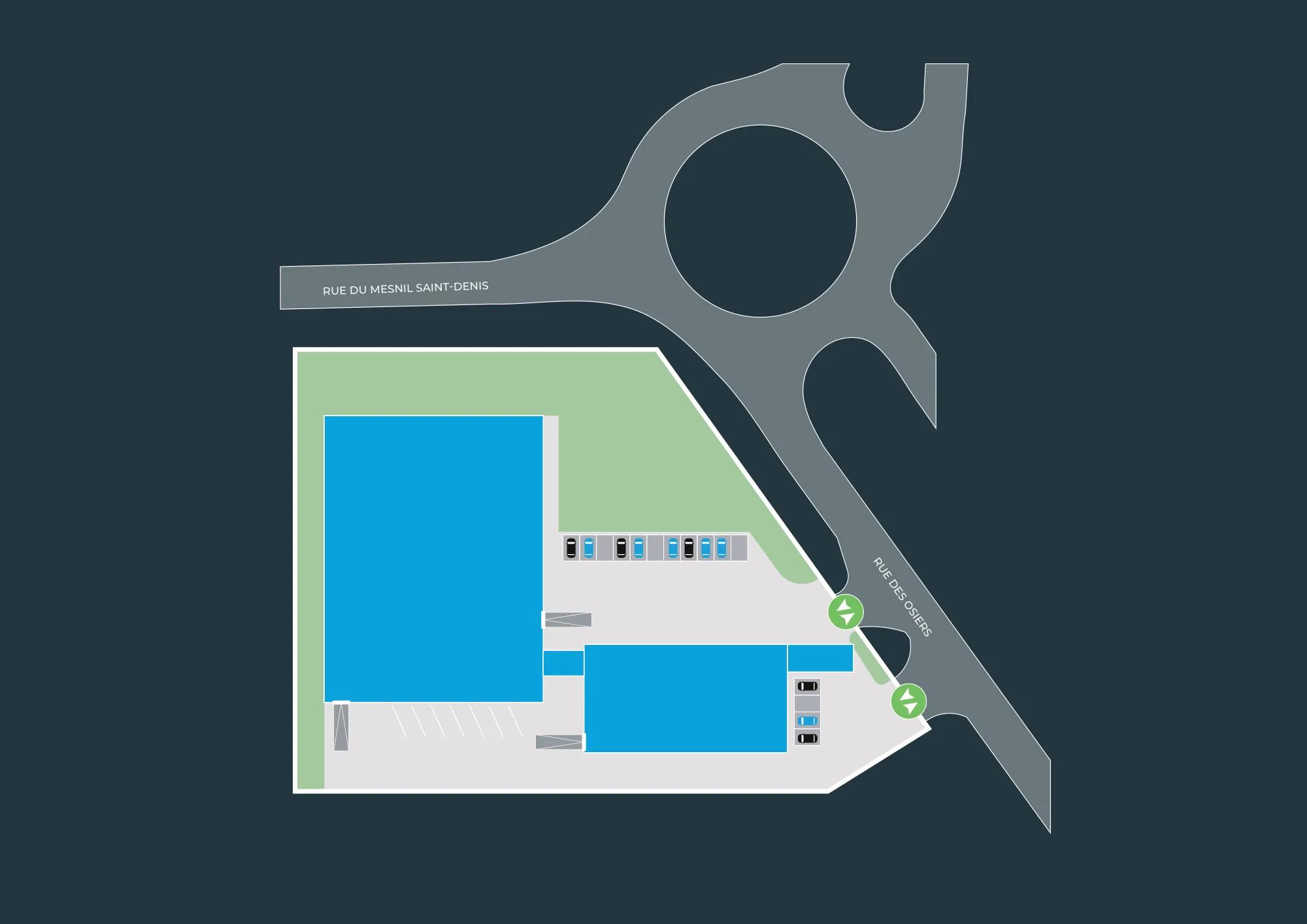 The building is located in the town of Coignières, 8 km from Trappes and close to the Les Portes de Chevreuse shopping center. Situated in the heart of the Marais Industrial Zone, the building enjoys an ideal geographical location for setting up a business, particularly due to its proximity to major roadways
