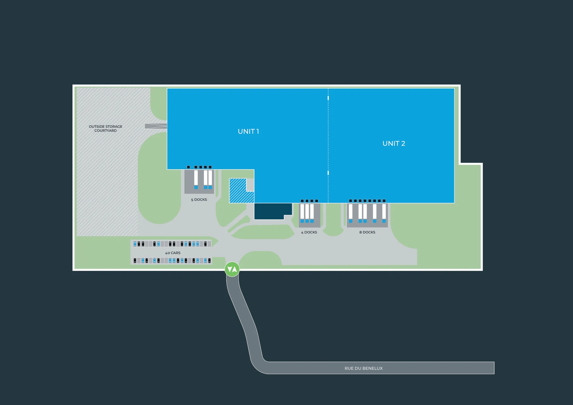 The facility is equipped with double-skin cladding, providing excellent insulation, and includes functional office spaces and social areas for staff. The steel deck roof guarantees effective protection against the elements, making this site ideal for businesses seeking to enhance their logistics and operational efficiency.
