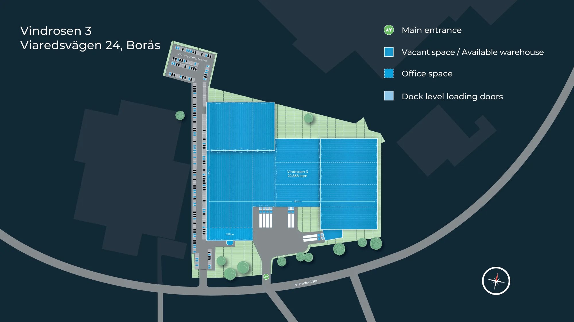 Rent a warehouse space of 22,838 sqm in Viared, Borås. Prime logistics location west of Gothenburg with excellent access to the E40 highway.