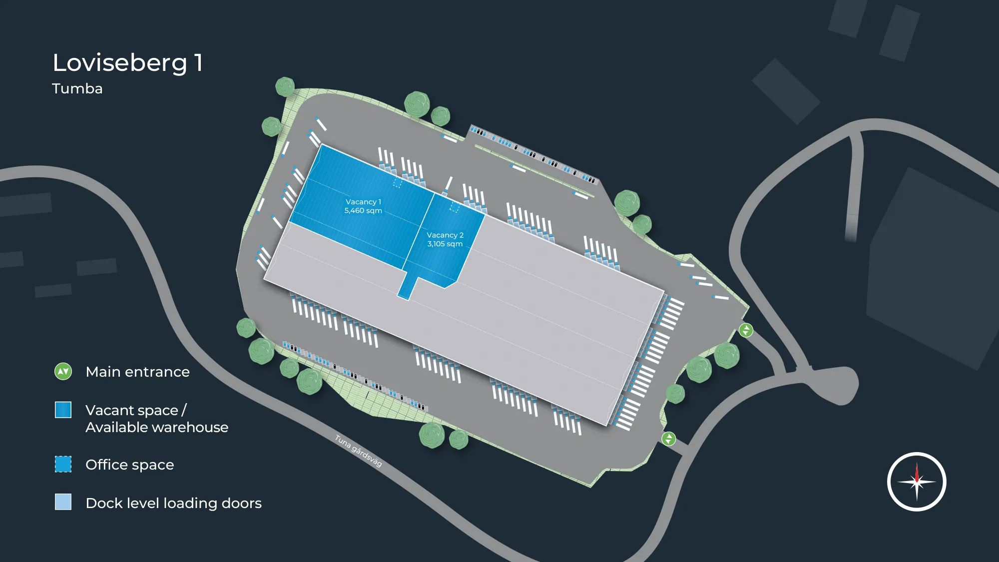 Secure a temperature-controlled warehouse in Tumba, a prime logistics location south of Stockholm. There are currently two available units offering 5,460 sqm and 3,105 sqm respectively. The property offers excellent access to highway E20. Located in Loviseberg, just 18 km from Stockholm City center, this property boasts a convenient connection to highway E20, linking Stockholm to Gothenburg and Malmö.