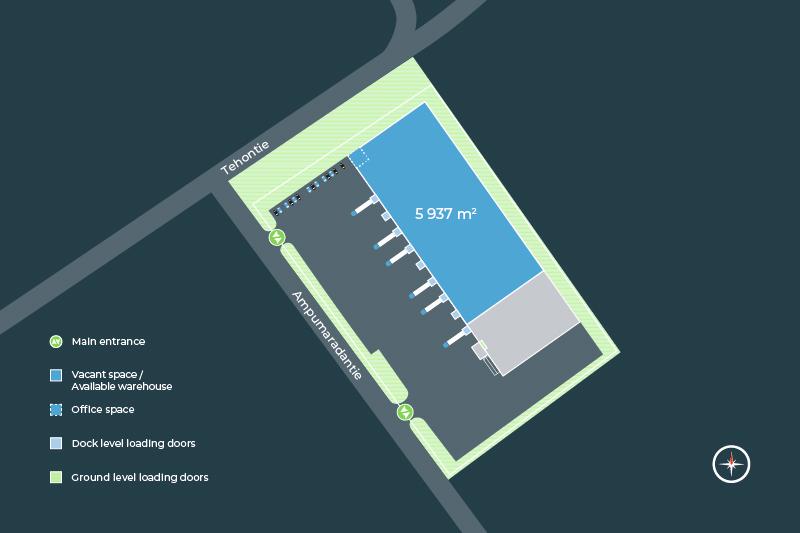 Varastotilat on mahdollista jakaa pienempiin, esimerkiksi 2000 m2 lohkoihin. Tilassa on pieni toimisto sekä sosiaali- ja taukotilat. Pihalla on pysäköintitilaa ja sähköauton latauspaikkoja.
